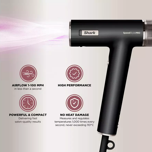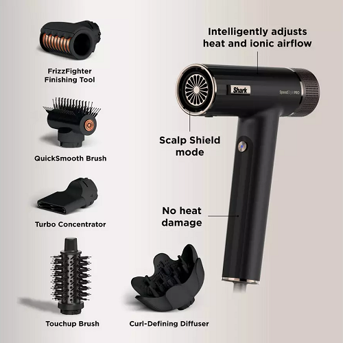 Meet the Shark SpeedStyle Pro Hair Dryer System. Designed for high performance and no heat damage, on all hair types. Includes Scalp Shield — designed to protect new hair growth from extreme heat. High-velocity airflow goes from 0-100 mph, delivering wet-to-dry styling with no heat damage. Achieve flawless salon-quality blow-dries, defined curls, and a high-gloss shine at home.